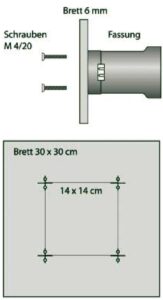 Die Bohrungen haben denselben Durchmesser wie die Schrauben, also 4mm. Mitunter ist es nötig auch die Bohrung im Deckel der Fassung ein klein wenig zu erweitern. Um die benötigte Schraubenlänge festzulegen, messen Sie einfach die in den Fassungen mitgelieferten Schrauben nach und kaufen solche, die um die Brettdicke länger sind, abzüglich ca. 1-2 mm. Bei unserem Modell mit 6mm Sperrholz sind diese Schrauben z.B.